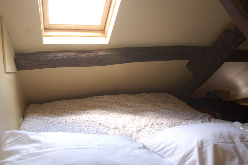Pictures of our 5th Arrondissement Paris apt, featuring living room with "Cuisine Americain," bedroom, 2 bathrooms, and a sleeping loft.